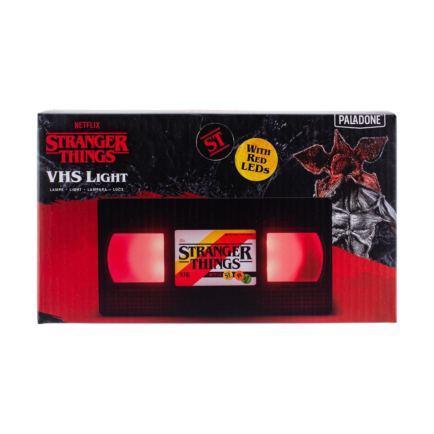 Φώτισε τον χώρο σου με μια δόση Upside Down! Το εντυπωσιακό αυτό φωτιστικό έχει σχεδιαστεί σαν κλασική VHS κασέτα από τα ’80s, με το αυθεντικό λογότυπο του Stranger Things και τις χαρακτηριστικές pop ρίγες. Όταν ανάβει, οι δύο “ταινίες” στις άκρες φωτίζονται με έντονα κόκκινα LEDs, δημιουργώντας ατμόσφαιρα Hawkins κατευθείαν από το δωμάτιό σου.